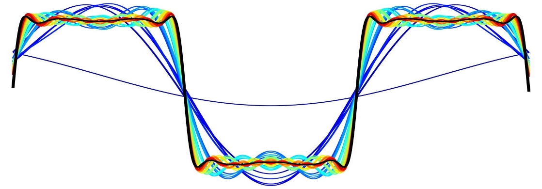 The colorful graph below showcases a technique for creating an equation from data points alone. The black line is a line connecting all of the data points and every other line is an attempt at creating an equation for these data points and then plotting the equation. It is possible to clearly visualize these equations becoming closer to black line until they converge as one.