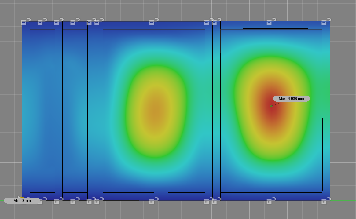 The pictures below are of a very simple simulation performed on a folding bedframe design. The deformations are accentuated to better visualize where the highest deformations occur. This example is merely a representation of what we are capable of.